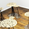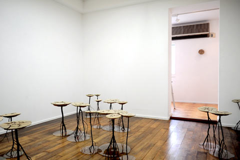 乾燥によるひびが走る土円板を、細い枝が支えながら自立し、寄り添い、呼応する姿を見せます。いろいろな大きさの土円板のひびと枝が見せる有機的なイメージから、あやうさ、もろさ、つながり、ひろがりを示唆する展示です。