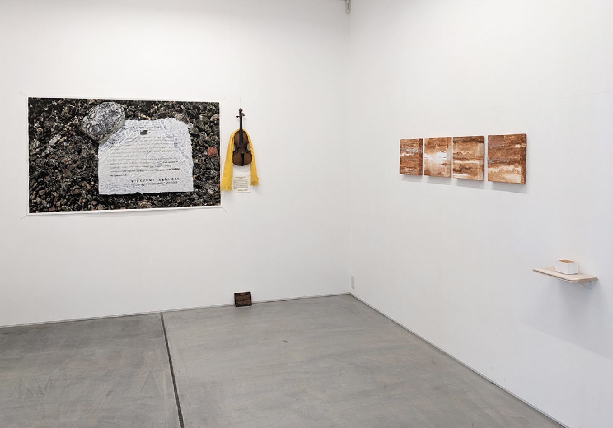 The approach I take towards expression stems from the relationships that become apparent by traversing various "elements" such as environment, topography, and culture. In a nutshell, it is "mapping." The starting point was in 2012, when my uncle's heirlooms, such as a violin and photos of his grave (in Siberia), served as triggers. In the summer of 2016, I headed to Irkutsk to trace the footsteps of my uncle's Siberian internment and conducted a survey. In the winter of 2020, I had the opportunity to participate in an artist residency on Olkhon Island, which floats on Lake Baikal (in Siberia), and was able to create works on site. This time, I would like to exhibit works from both summer and winter, along with newly created pieces, and wish to deepen my thoughts through the "something" that emerges from the current social situation.