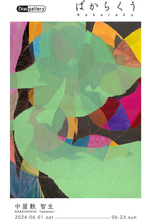 この度 2kw gallery では、画家・中屋敷智生個展「ばからくう」を開催いたします。近年、中屋敷はマスキングテープを絵具と同様の画材・メディウムとして使用しており、コラージュや切り絵を彷彿させる独特のレイヤーとテクスチャーのある絵画作品を数多く発表しています。マスキングテープは時に線や色面として、また時に物理的なレイヤーとして画面に出現します。キャンバス上で渾然一体となった絵具・マスキングテープ・余白は図と地の関係を曖昧にし、われわれの網膜像に由来する視覚認識(知覚・直観・思考)がいかに不確かであり、また美しいものであるかということを顕在化するでしょう。この機会にご高覧いただけますと幸いです。