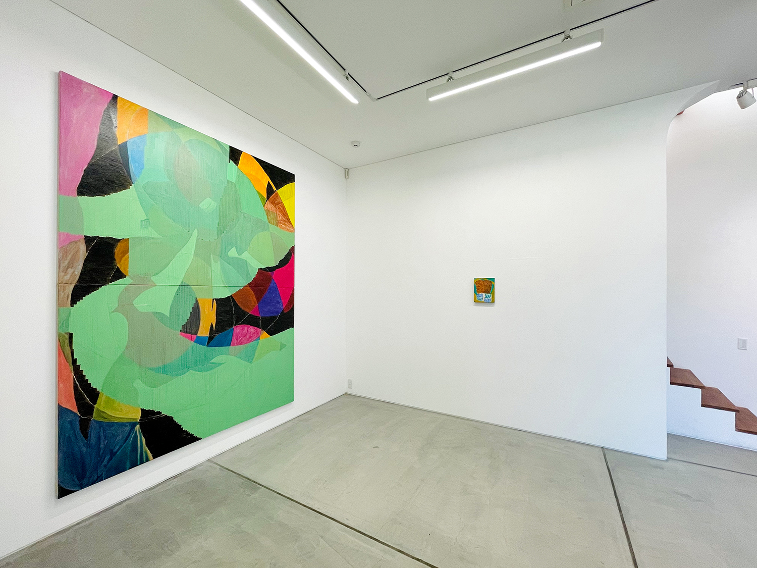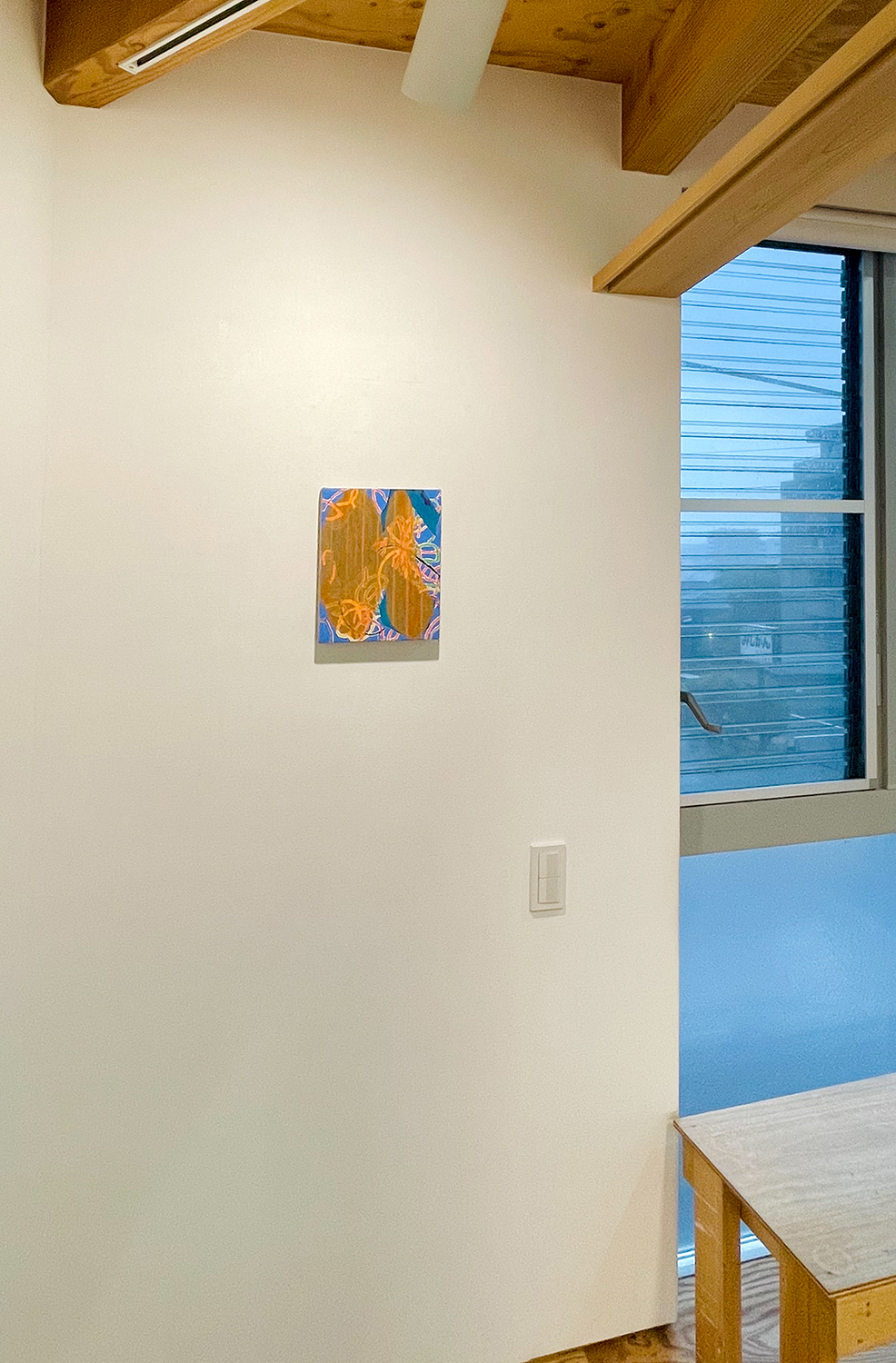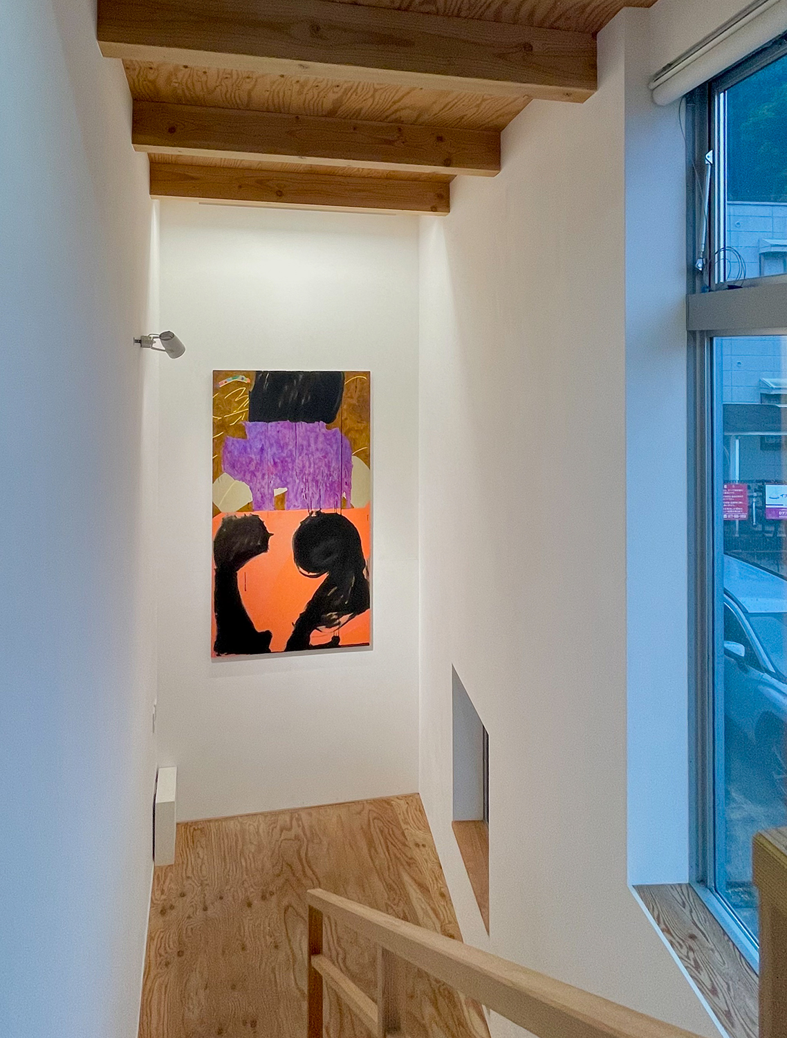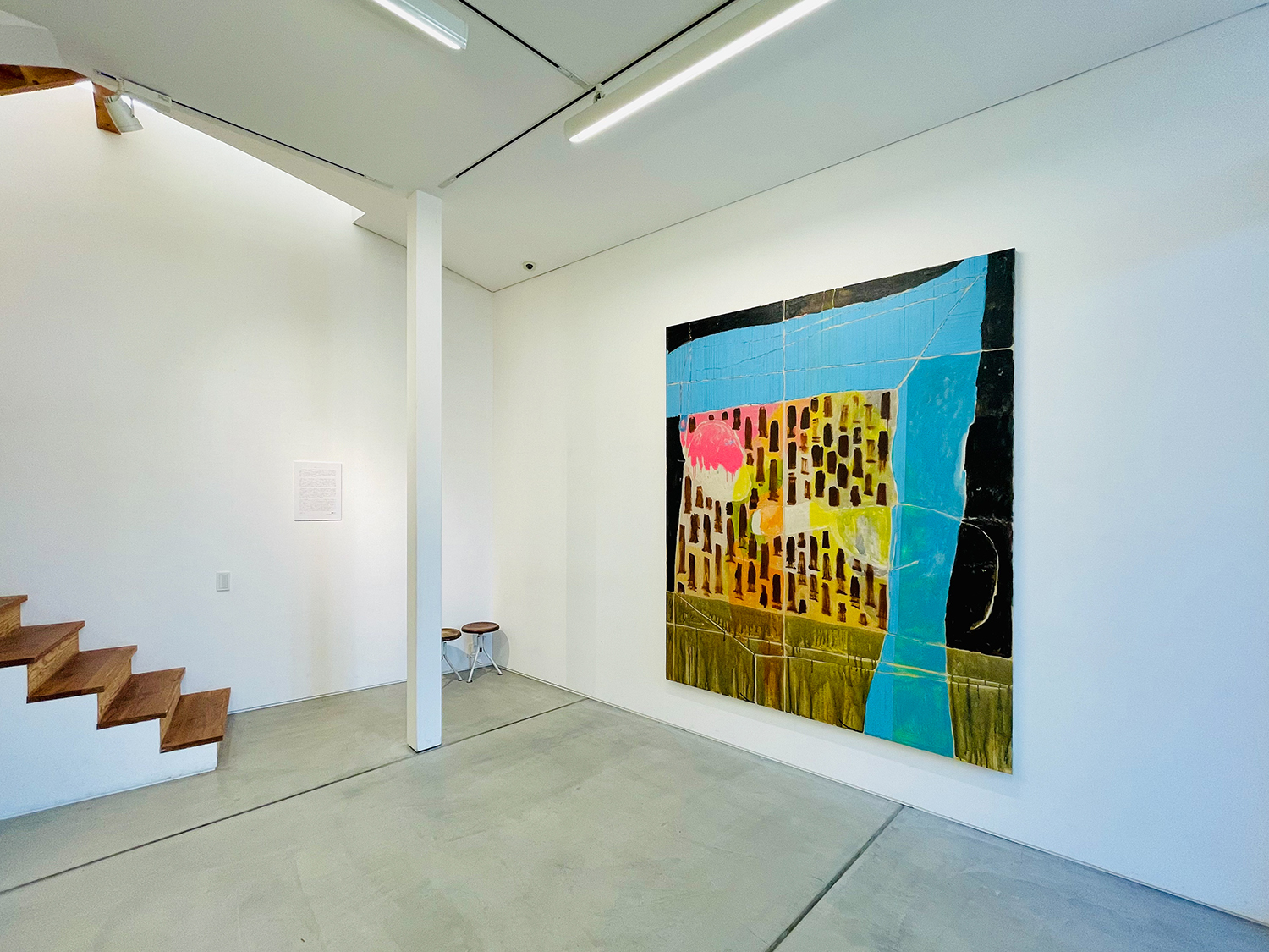 本展「ばからくう」は大型作品を中心に、ギャラリー全体を絵画で包み込むような空間として構成しています。この試みは、マーク・ロスコが 1958 年に「シーグラム壁画*」を制作した際の、「絵画ではなく場を作った」という言葉にインスピレーションを得ています。ロスコは抽象表現主義の画家でしたが、フォーマリズムには傾倒せず、独自の神秘思想やギリシャ神話などの宗教的要素を作品に取り入れました。しかし、展示空間に「場」を生成するという考えは、ともすると絵画から自立性を奪い、それらを環境装飾へと近づけてしまう危険性をはらんでいます。絵画はそのとき、鑑賞者を自らの前に立ち止まらせる力を失い、むしろ彼らを止めどない歩行へといざなうことになるでしょう。わたしたちは、シーグラム壁画でロスコが目指した「場」という理想郷に、安易に足を踏み入れるべきではないのかもしれません。