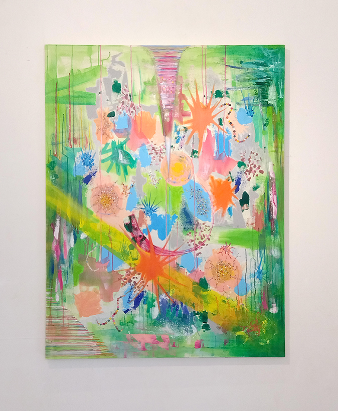 色彩と形を媒体にそこから変化していく作品は、今までにないプロセスを経て完成させました。30 年近く制作していると、オートマチックに作品のプロセスが流れていきがちですが、それは制作活動における、自分に潜在的にある色彩や、構図の定着のされ方に影響するものと思われます。
