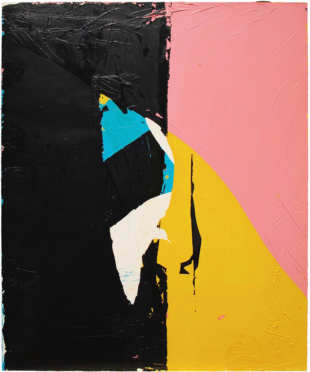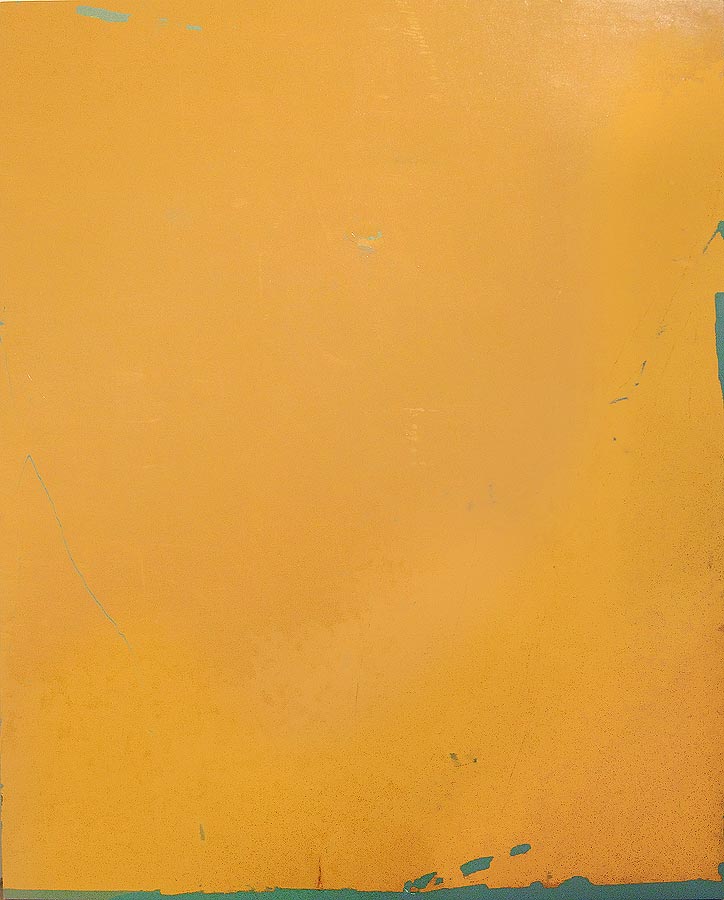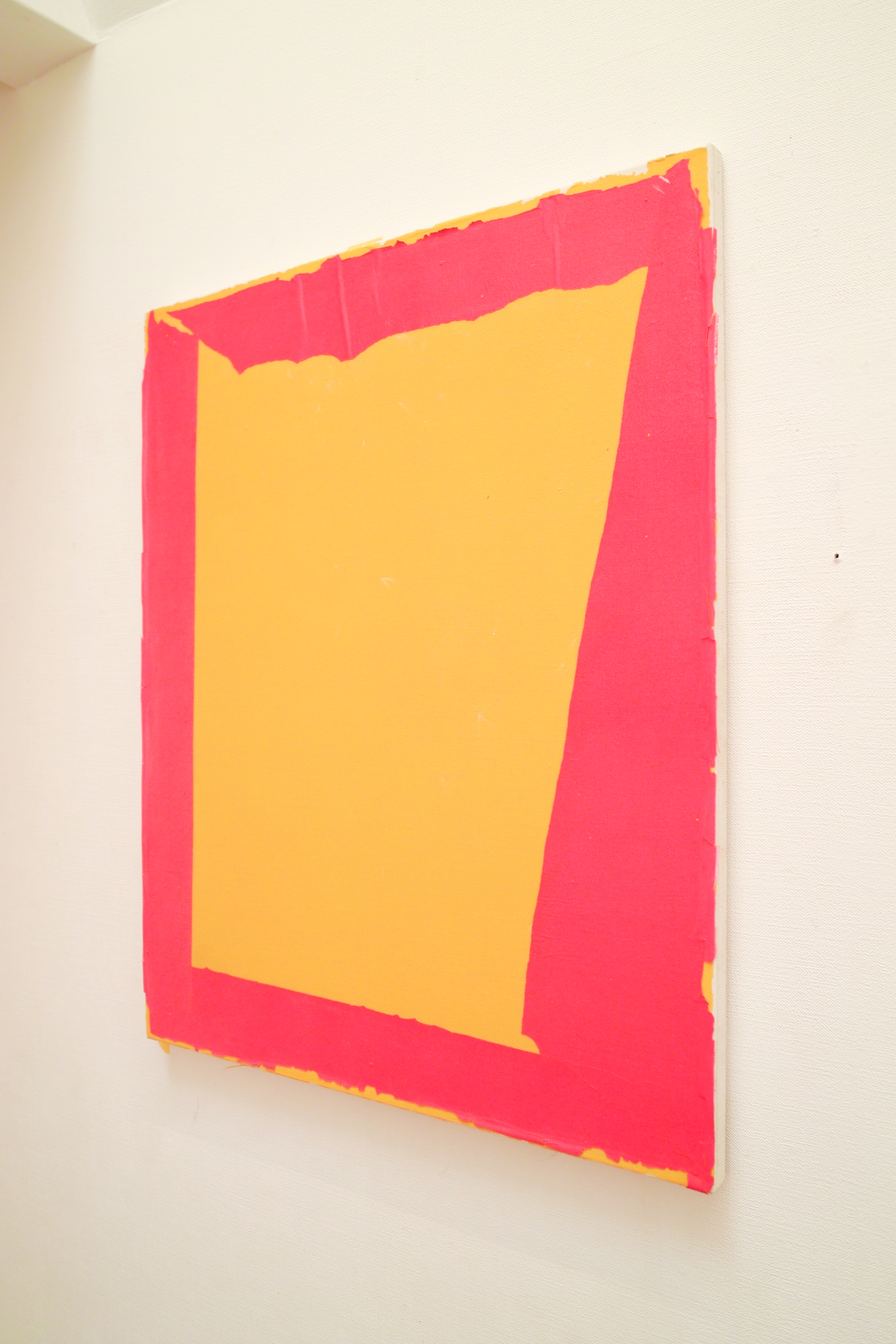 基本的に関口の絵画は、シリコン板に油絵具を塗り、それらを生乾きの状態で剥がすこと生まれる被膜をキャンバスに貼り付けるという方法で作られています。絵具の膜による絵画は、絵画の前提(重力、矩形、図と地、人間)を揺さぶるものでした。